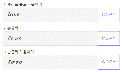 입력의 빨간색 박스에 원하는 문구를 입력 후 옆에 [생성]버튼을 눌러주면 하단에 해당 글씨체에 맞는 문구가 생성되어 오른쪽에 [복사] 버튼을 눌러서 원하는 곳에 [붙여넣기]로 사용하면 됩니다.